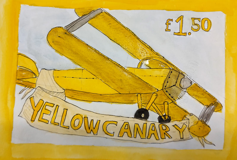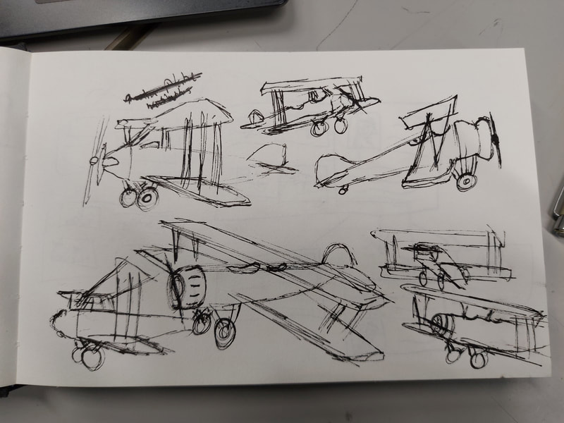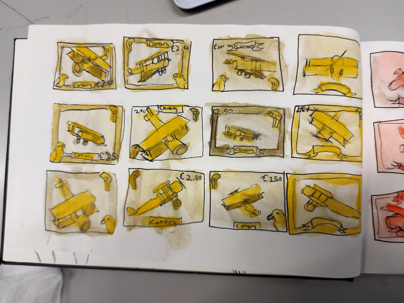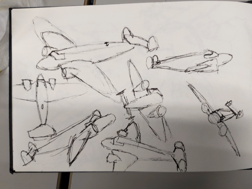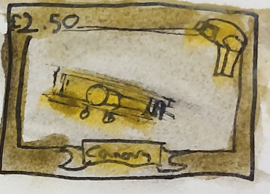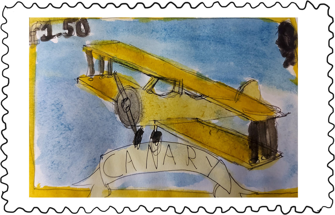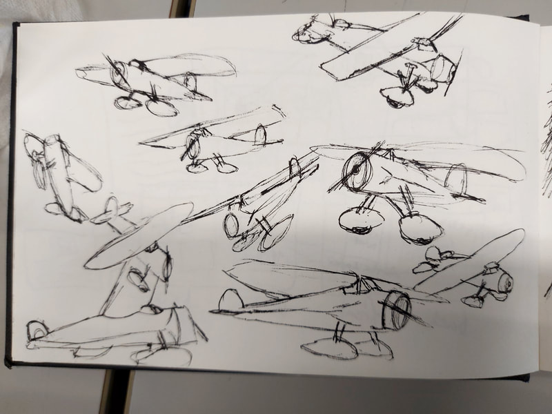 Sketckes of planes (and side piece). The canary birds stay but i gave up on the side drawing just for now. The idea was to have the animal that the planes were named after in the side of the stamps.