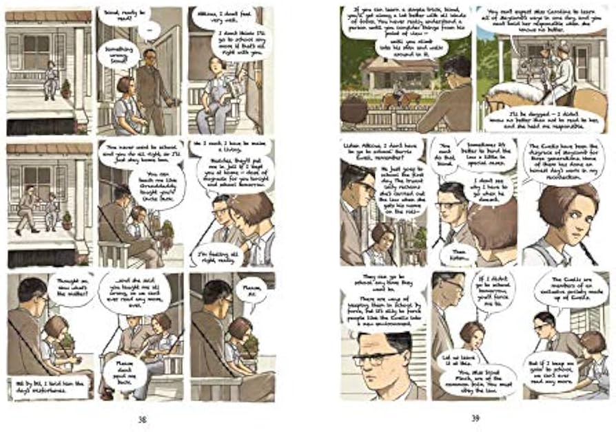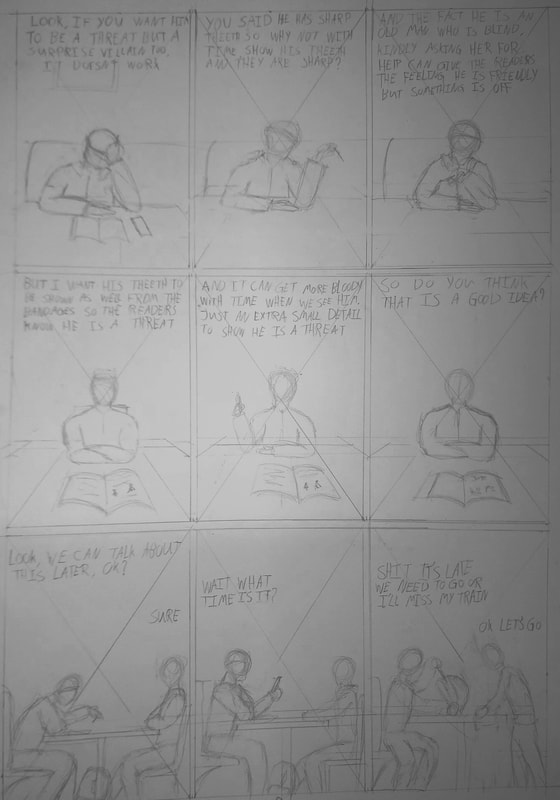 It feels little bit like its a storyboard sometimes in this book. A lot of speech bubbles in the book so to prevent making a lot of details and it will be gone when the speech bubbles pops up, the drawings are sometimes close up of the person face or soomed out to give more emotions of their words. Due to having a lot of text and words in my story, seeing how the "TO KILL A MOCKINGBIRD" by Harper Lee graphic novel is drawn, show i can have some panels mostly like half of the panel drawn and the other half for the text. For instant the second page of the comic is 80% just talk and nothing happening. |